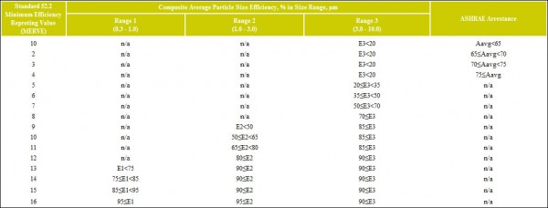一个“整体”的报告值的52.2评价空气过滤器的最低能效报告的价值(MERV)的表达。MERV是单一的数,即用,随着在测试进行的空气速度,以简化的试验方法,所产生的大量数据。MERV表示上的16点的规模和来自从PSE的三组中的每个。(见表3:MERV参数)。 平均PSE为每个三组(E1,E2和E3)是参照的最小效率报告值参数(见表3:MERV参数)。向上移动的适当的范围组(E1,E2和E3)在表3中,并记录MERV到左侧的第一个真正的语句。所有三组。 表3:MERV参数