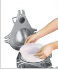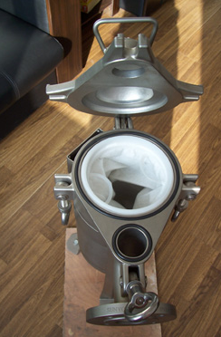 3、放置滤袋,使滤袋环口和金属内网领口吻合。注意:如果使用的是车缝滤袋,请将滤袋的车缝边折叠后放入,可以提高车缝滤袋的过滤效果。
